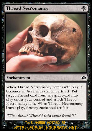 When Thread Necromancy comes into play it becomes an Aura with enchant artifact. Put target Thread card from any graveyard into play under your control and attach Thread Necromancy to it. When Thread Necromancy leaves play, destroy enchanted artifact.