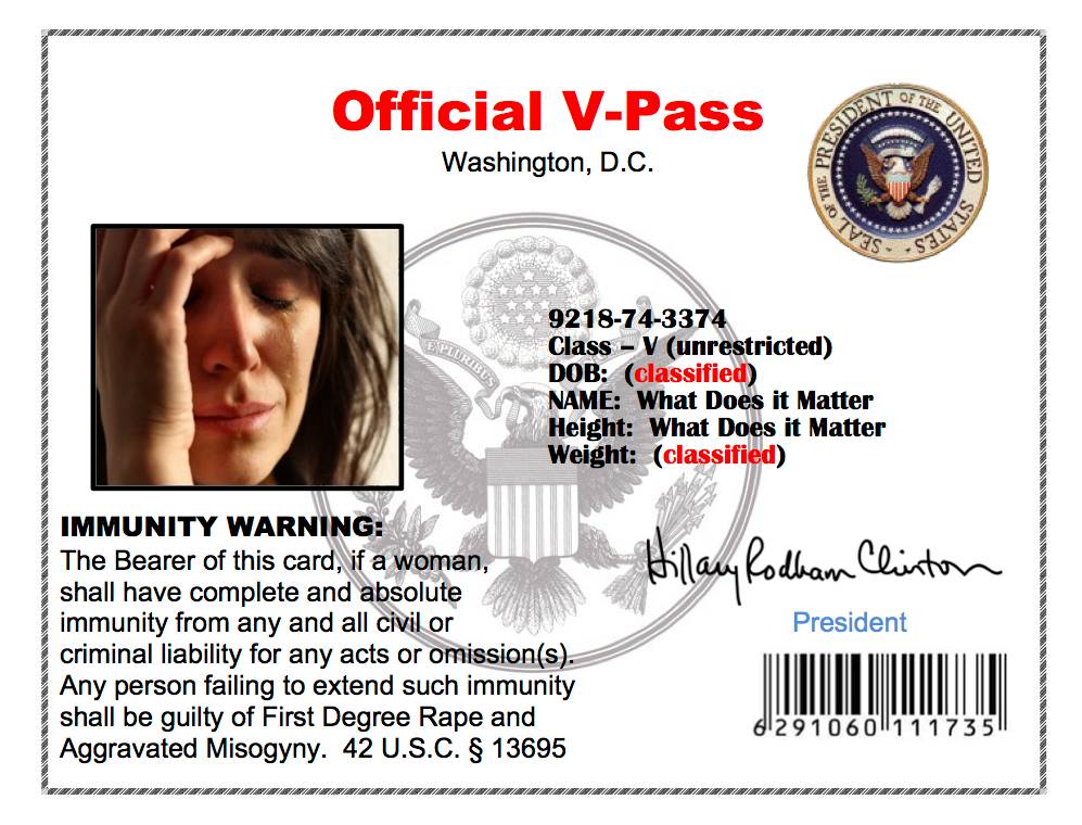 The Bearer of this card, if a woman, shall have complete and absolute immunity from any and all civil or criminal liability for any acts or omission(s). Any person failing to extend such immunity shall be guilty of First Degree Rape and Aggravated Misogyny. 42 U.S.C. § 13695