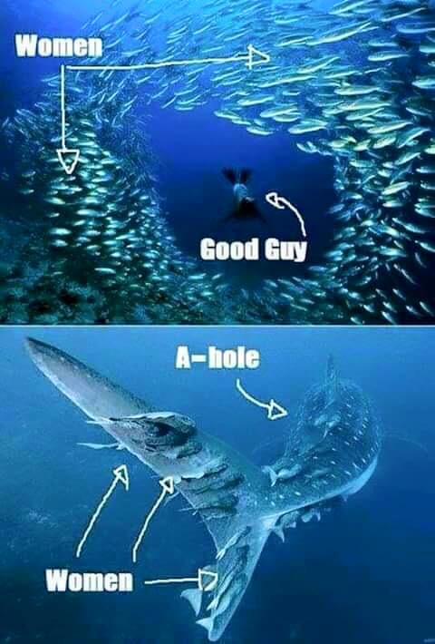 A fish illustration of how women flee from good guys and cling to assholes like magnets