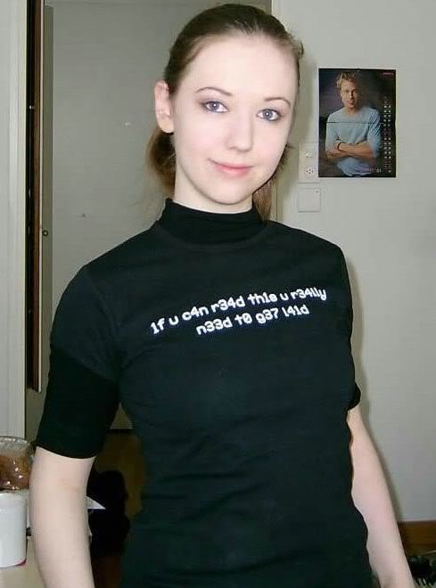 A classic "1f u c4n r34d th1s u r34lly n33d t0 g37 l41d" T-shirt. Forgive me if I got a few characters wrong, I just hate leet (yeah, apparently that's what 1337 means).
