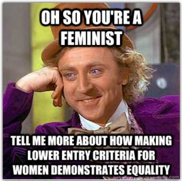 Oh, so you're a feminist... tell me more about how making lower entry criteria for women demonstrates equality.