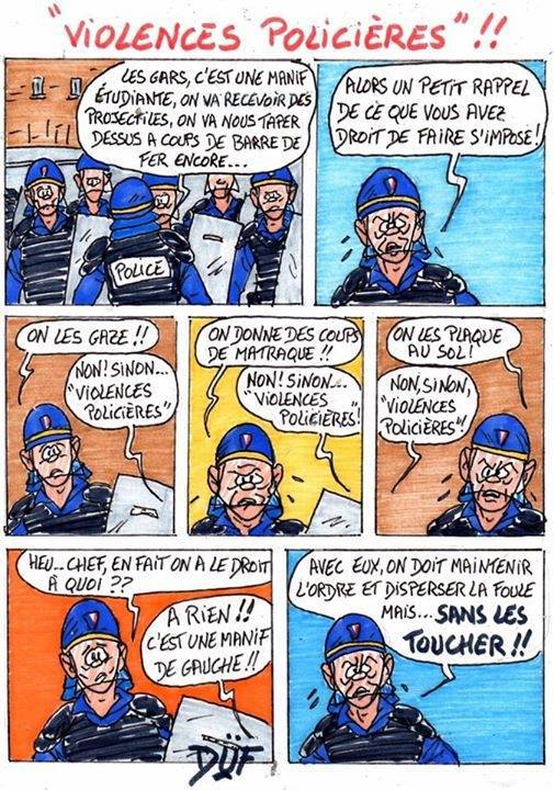 - Les gars, c'est une manif étudiante, on va recevoir des projectiles, on va nous taper dessus à coups de barre de fer encore... Alors un petit rappel de ce que vous avez le droit de faire s'impose :
