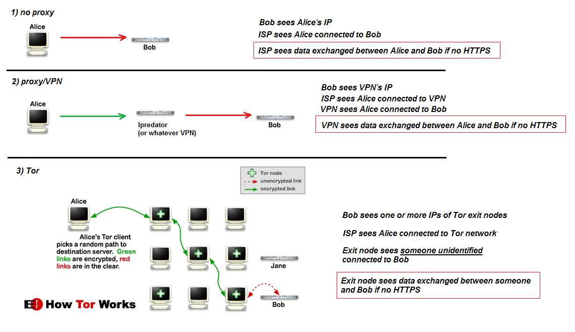 - Internet Service Provider (ISP) sees Alice connected to Bob