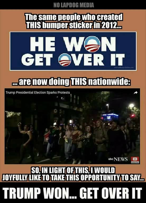 The same people who created the "he won get over it" sticker in 2012 are now protesting against Trump's election everywhere.