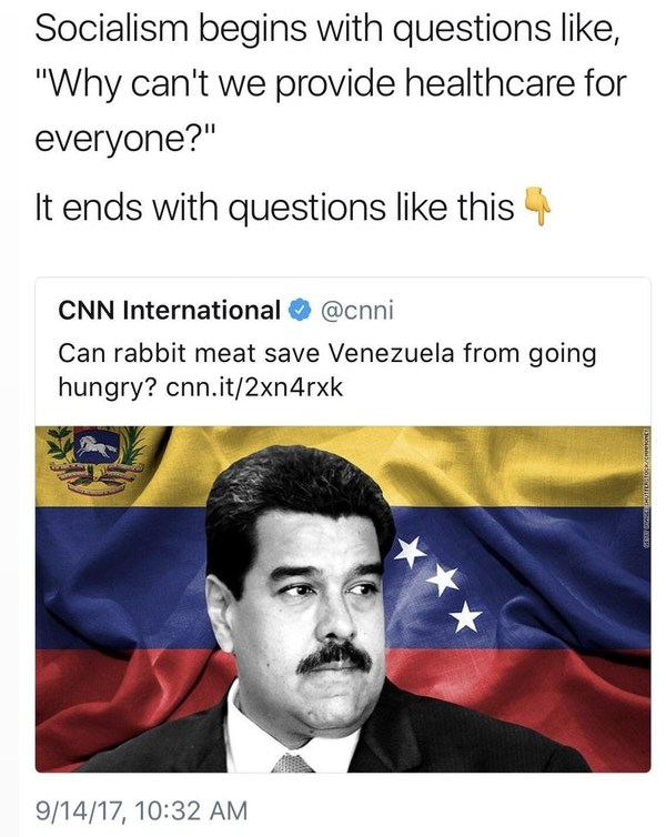It ends with questions like: "Can rabbit meat save Venezuela from going hungry? cnn.it/2xn4rxk"