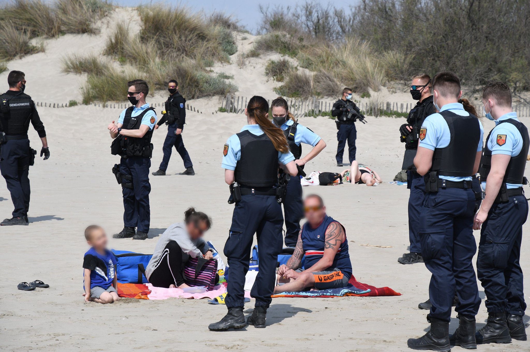 Policemen evacuating people from a beach, because going to the beach was forbidden because of covid. It's such a dangerous place with a huge risk of contagion, you see...