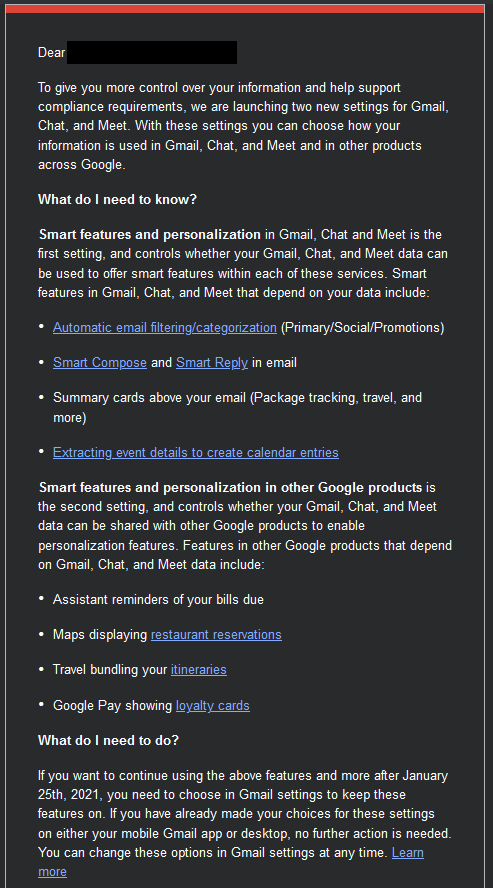 A message from Google *finally* allowing users to disable some of their profiling in the settings, making it look like it was their initiative to improve things, while they simply just had been breaking European privacy laws such as GDRP for years (e-mail around January 2021, GDPR enforceable since 25 May 2018).