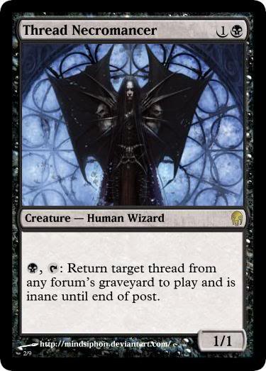 Return target thread from any forum's graveyard to play and is inane until end of post.